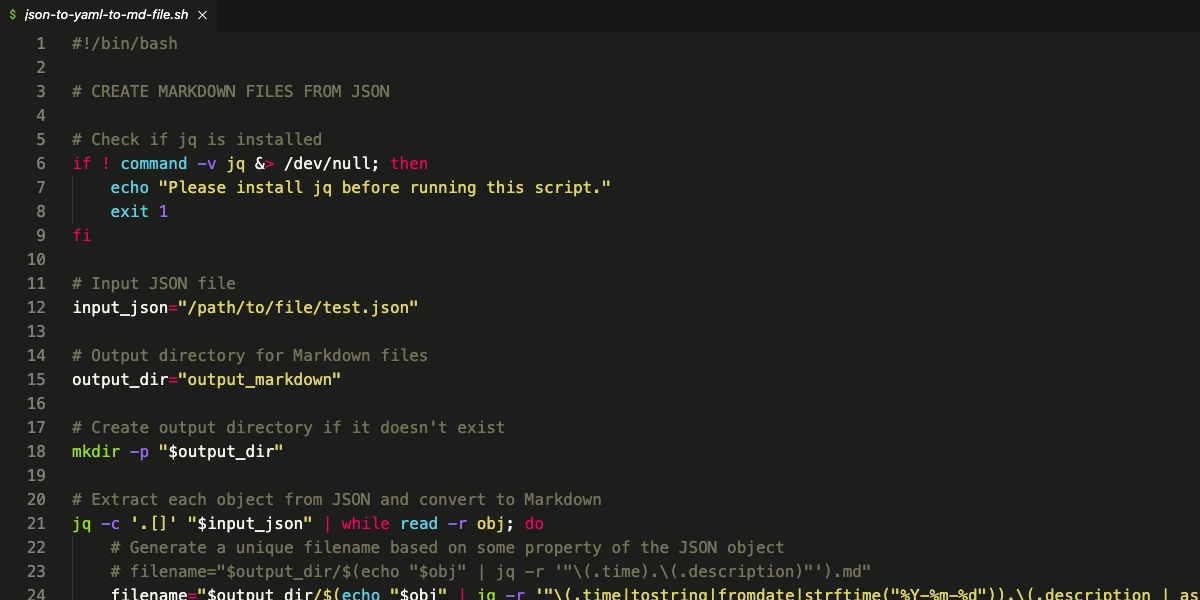 First thing I tackled was extracting each object from JSON and convert it to a Markdown file. I'm using jq command-line JSON processor to format the data as needed. This part of the script checks first if jq is installed, find the .json file to work with, create a directory to create the markdown files into, use the .time and .description key property to use for naming the markdown file. I also had to format the JSON key/value pair into a YAML structure. This was easy enough with exception to the tags property to list the value's in a listed structure. I tackled this in the second part of the shell script. Originally I created all these parts of the shell script in separate scripts in order to keep testing simple and easy to manage.