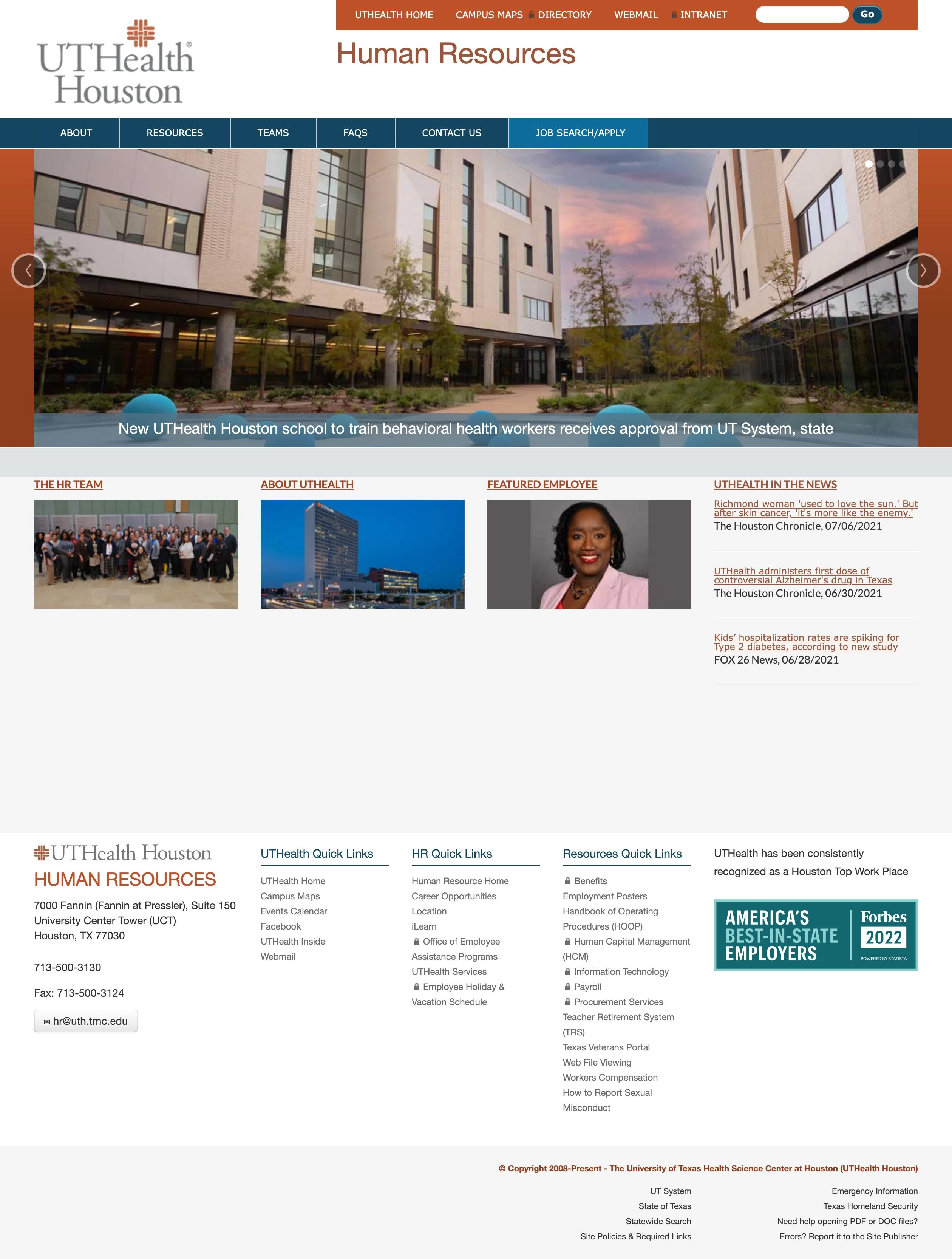 Starting today I will work for UTHealth's HR department, specifically the Innovation, Analytics, and Technology Team. This is an extremly rare opportunity for me because for a majority of my web development work history I've worked on university wide websites. What that means is that my work affected globally all the university website properties. These are the highly and most trafficked websites for the universities. This was a huge responsiblity to take on and run like a well oiled machine. I did pretty good if I must say so.
